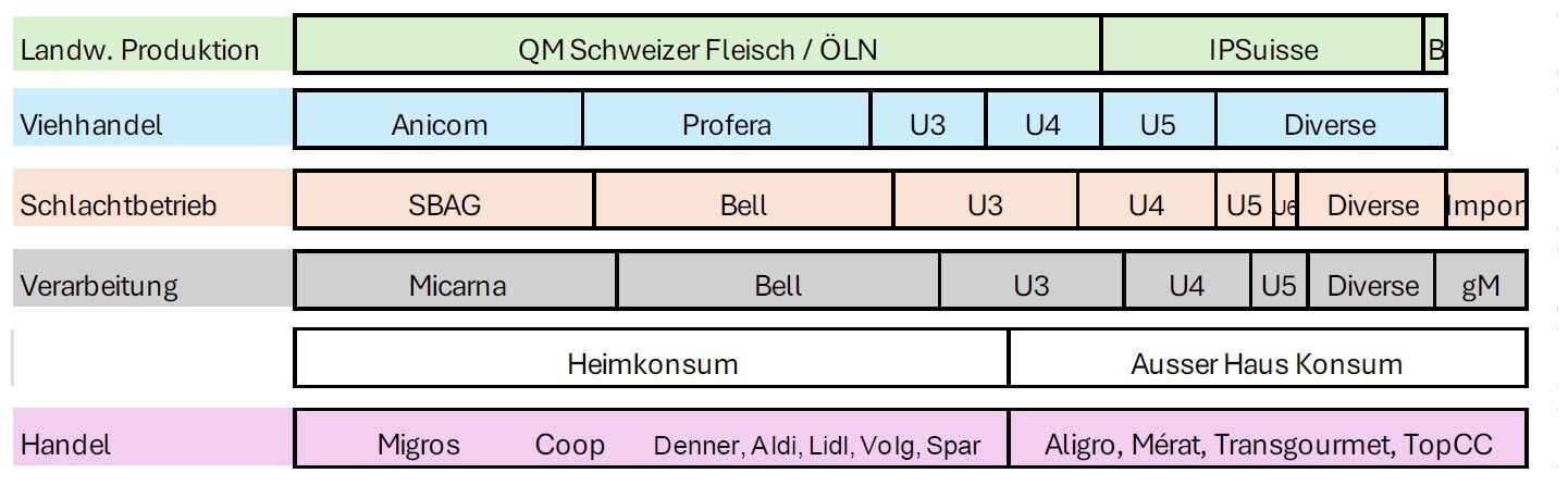 Auch in der Verarbeitung spiele eine kleine Zahl grosser Fleischverarbeiter eine zentrale Rolle. Verarbeitete Produkte und Convenience-Fleisch («bequeme» Fleischprodukte, wie marinierte Schnitzel) gewinnen an Bedeutung, was die Macht der grossen Verarbeiter weiter stärke. Im Detailhandel dominieren Migros und Coop den Markt und würden Preise und Sortimente wesentlich beeinflussen.