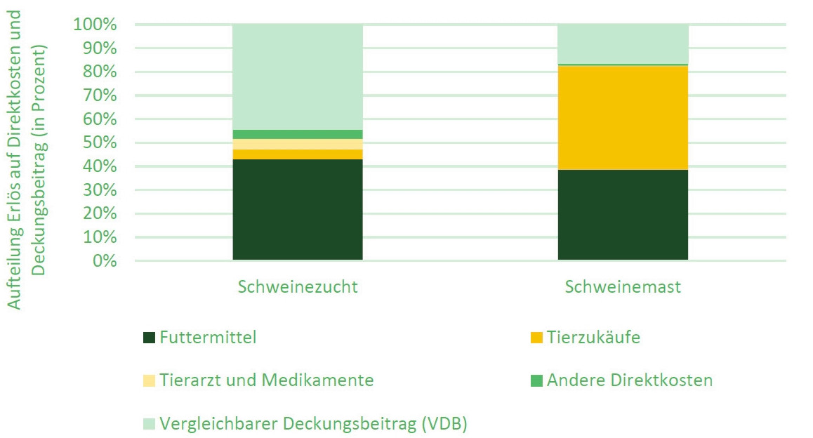 Aufteilung des Erlöses in der Schweinezucht und in der Schweinemast 2023 in Direktkosten und Deckungsbeitrag.