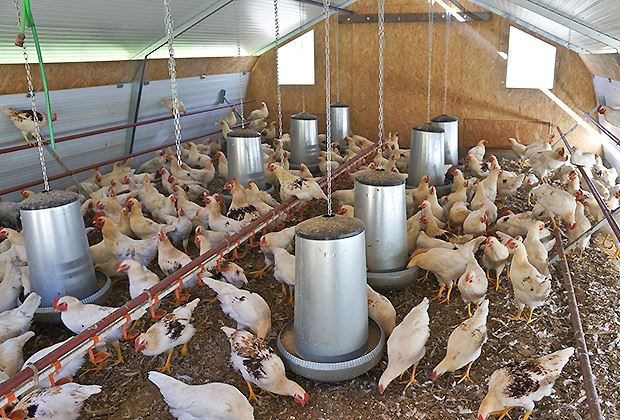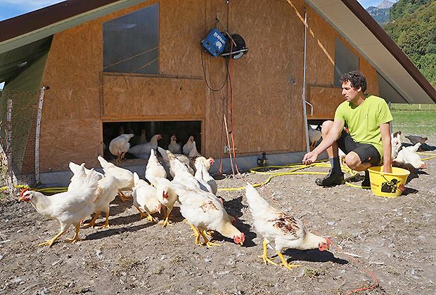 Anfang 2016 bekam er die ersten männlichen Küken für die dreiwöchige Vormast. Danach verlegte er die Bruderhähne für 100 Tage in einen seiner fahrbaren Mastställe, wo den maximal 500 Tieren auf den 45 Quadratmetern genügend Platz, Futter, Wasser und Sitzstangen zur Verfügung stehen. Die Weide umfasst 1500 m2, was drei Quadratmetern pro Tier entspricht. Nach jeder Mast erfolgt ein Weidewechsel, um die Böden nicht zu stark zu belasten. "Bei uns ist die Mast sogar Teil der Fruchtfolge, aktuell zum Beispiel mit Mais. So können wir die Nährstoffe ideal verwenden."
