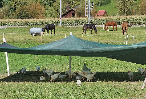 Nicht so bei Bio-Meisterlandwirt Roman Clavadetscher in Malans. Auf seinem Hof spazieren Hähne in ihrem grosszügigen Gehege herum. Sie sind das männliche Pendant zu Legehennen und werden Bruderhähne genannt. Sie scharen sich um den Ausmaststall oder finden Schatten unter dem Sonnensegel. Gerne plustern sie sich im Sand auf. Sie picken im Gras und finden immer etwas, das ihnen schmeckt. Ein idyllisches Bild.