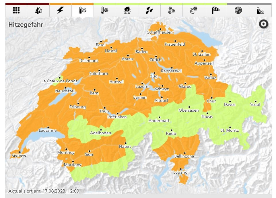 Für die gesamte Schweiz gilt ab Samstag und bis und mit Mittwoch kommender Woche unterhalb von 800 Metern über Meer die Gefahrenstufe 3. Diese beinhaltet laut Angaben von Meteoschweiz ein erhebliches Risiko für Kreislaufbeschwerden und körperliches Unwohlsein für Menschen.