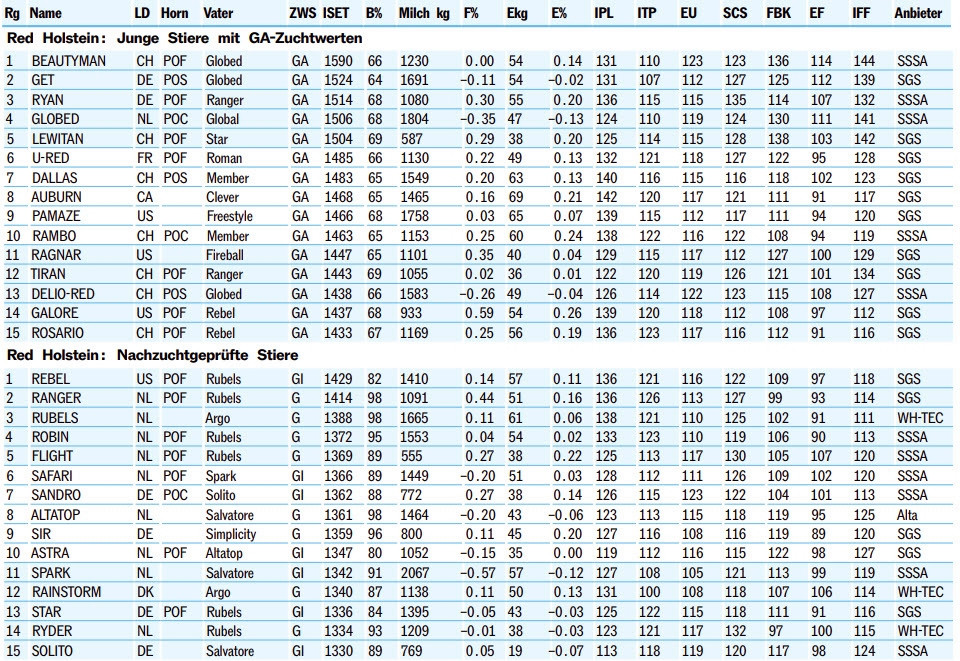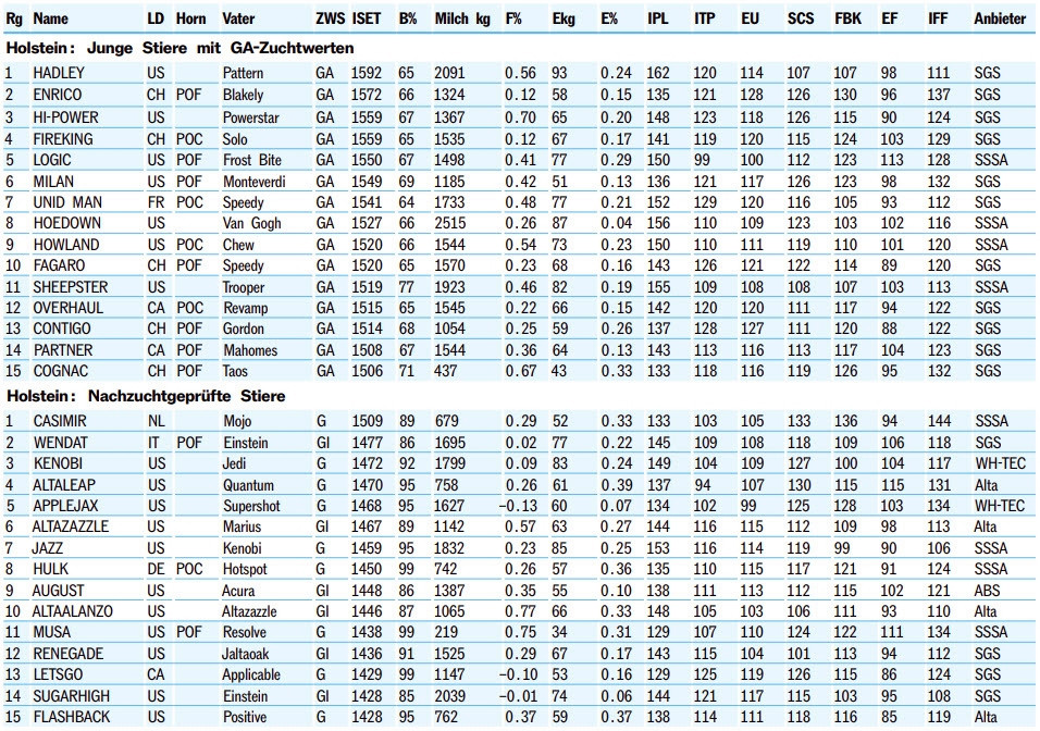 Abkürzungen: Rg Rang; LD Land; Horn Hornstatus (POC mischerbig hornlos, POS reinerbig, POF behornt); ZWS Zuchtwertschätzverfahren (CH national, G GOZW, I Interbull, GI GOZW und Interbull kombiniert, GA GOZW nur mit Ahnenleistungen kombiniert); ISET Index Selektion Total; B% Sicherheit; F % Zuchtwert Fett-%; E kg Zuchtwert Eiweiss kg; E % Zuchtwert Eiweiss-%; IPL Index Produktion Leistung; EF Zuchtwert eingespartes Futter; ITP Index Typ; EU Euter; SCS Zellzahl; FBK Zuchtwert Fruchtbarkeit; IFF Index Funktionalität Fruchtbarkeit; Anb Anbieter (SGS Swissgenetics, SSSA Select Star, Gunt. Guntersweiler; Früh Früh Rudolf; Alta Alta Genetics; div. diverse).