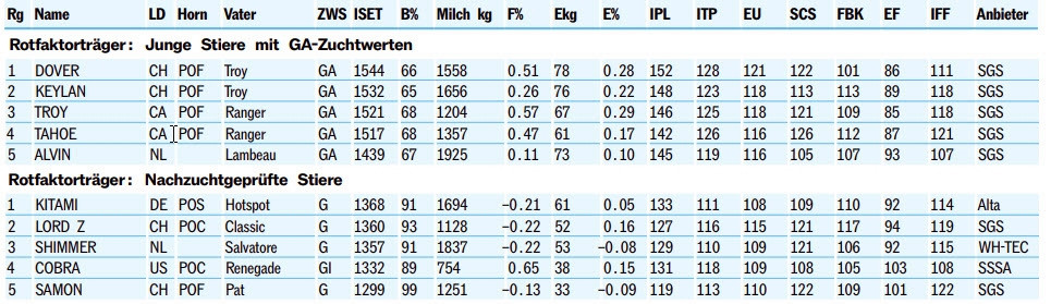 Weiterhin stark ist der Hotspot-Sohn Kitami bei den RF-Vererbern mit Nachzuchtresultat. Exterieurmässig führen Alpha, Addison und Max, der ein Luster-Bruder zu Mirand ist, die Liste an. Die Troy-Söhne und Schweizer Stiere Dover und Keylan stehen auf der ISET-Liste der genomischen Stiere zuoberst, gefolgt von ihrem Vater. Dover ist zudem mit 128 ITP top für das Exterieur, hier muss er sich von Dauerbrenner Hulu sowie dem hornlosen Stellar geschlagen geben.