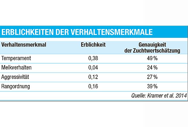 Bieber zieht ein interessantes Fazit: «Die Verhaltensmerkmale der Kühe weisen teilweise erstaunlich grosse Erblichkeiten auf (siehe Tabelle). Sie lassen sich züchterisch teilweise besser bearbeiten als erwartet. Dies auch dank der genomischen Zuchtwertschätzung.» Das gelte im Übrigen auch für die Eutertiefe, so Bieber.