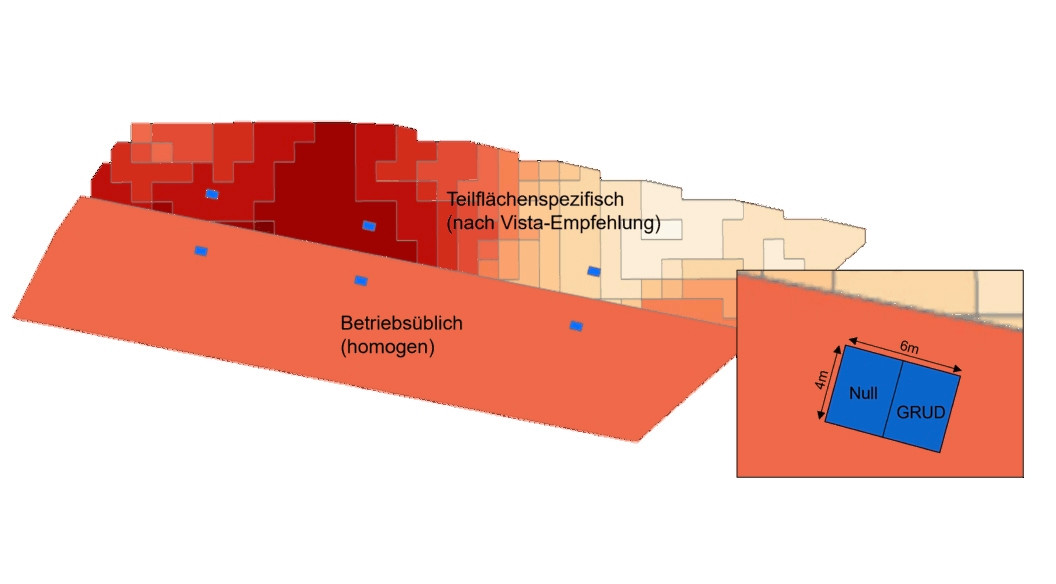 Versuchsdesign auf einem Weizenfeld. Verglichen wurden betriebsübliche Düngung (homogen) und teilflächenspezifische Düngung anhand von Applikationskarten. Auf Kleinparzellen wurde die Düngung nach GRUD Nmin umgesetzt.