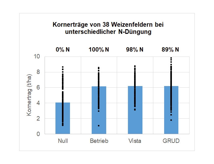 «Die guten Ergebnisse der ‹Grundlagen für die Düngung landwirtschaftlicher Kulturen in der Schweiz› (GRUD) auf den Kleinparzellen sind ein Hinweis, dass ein deutlicher Mehrwert entsteht, wenn die GRUD bei der Berechnung der Düngermenge berücksichtigt und diese dann teilflächenspezifisch verteilt wird», schreibt Agridea, die landwirtschaftliche Beratungszentrale.