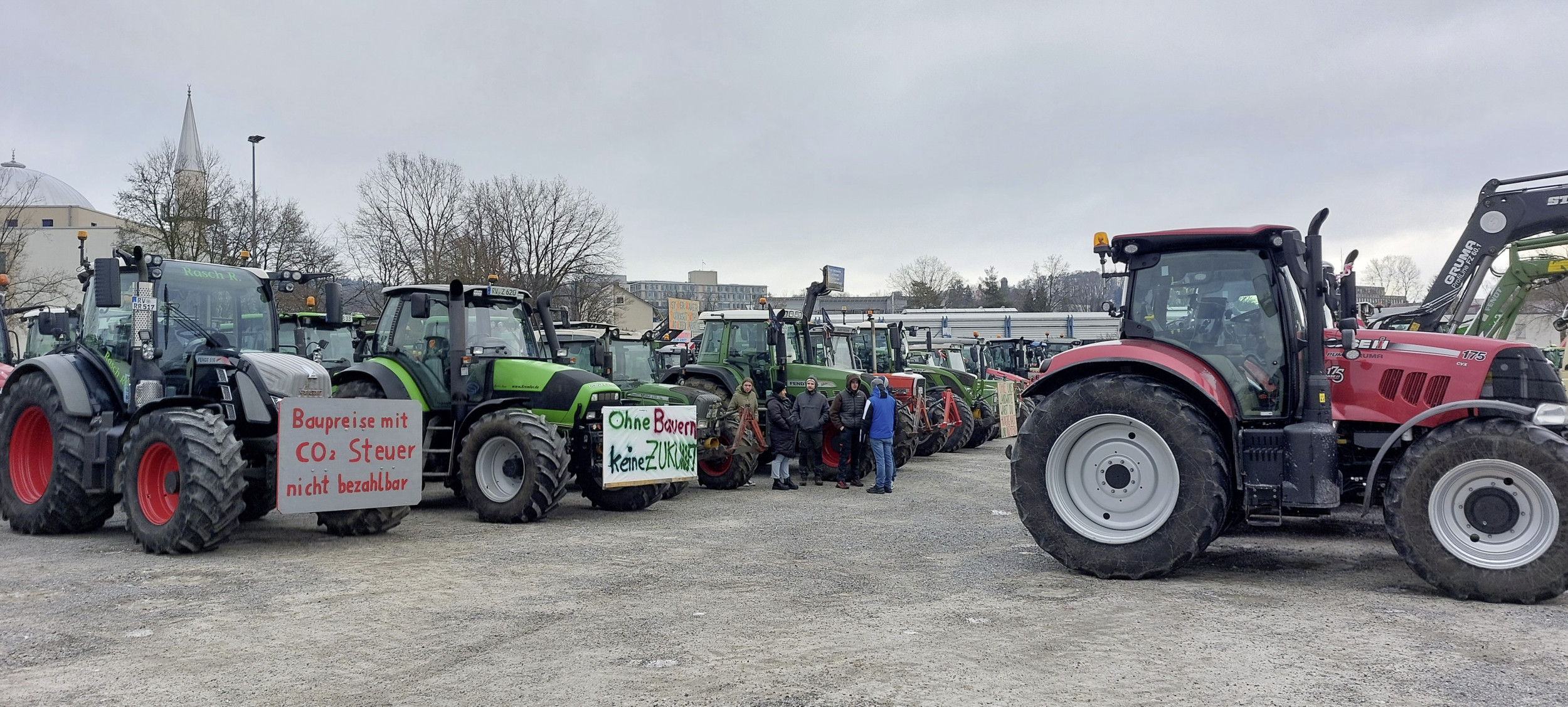 Am Montagmorgen fanden sich gemäss den Veranstaltern mindestens 1400 Traktoren sowie rund 30 LKWs bei der Oberschwabenhalle in Ravensburg ein. Die ersten Schlepper waren bereits – trotz eisigen Temperaturen – am frühen Morgen vor Ort. Im weiteren Verlauf des Vormittags trafen die weitere Schlepper ein. Während die letzten Traktoren ankamen, machte sich der gesamte Demonstrationszug gegen elf Uhr bereit, in Richtung Innenstadt loszuziehen. Der mehrere hundert Meter lange Zug setzte sich – unter lautstarken Rufen wie «Zu viel ist zu viel», «Das Fass ist voll» oder «Gibt es keine Bauern mehr- bleibt der Teller leer» – in Richtung Marienplatz in Bewegung.