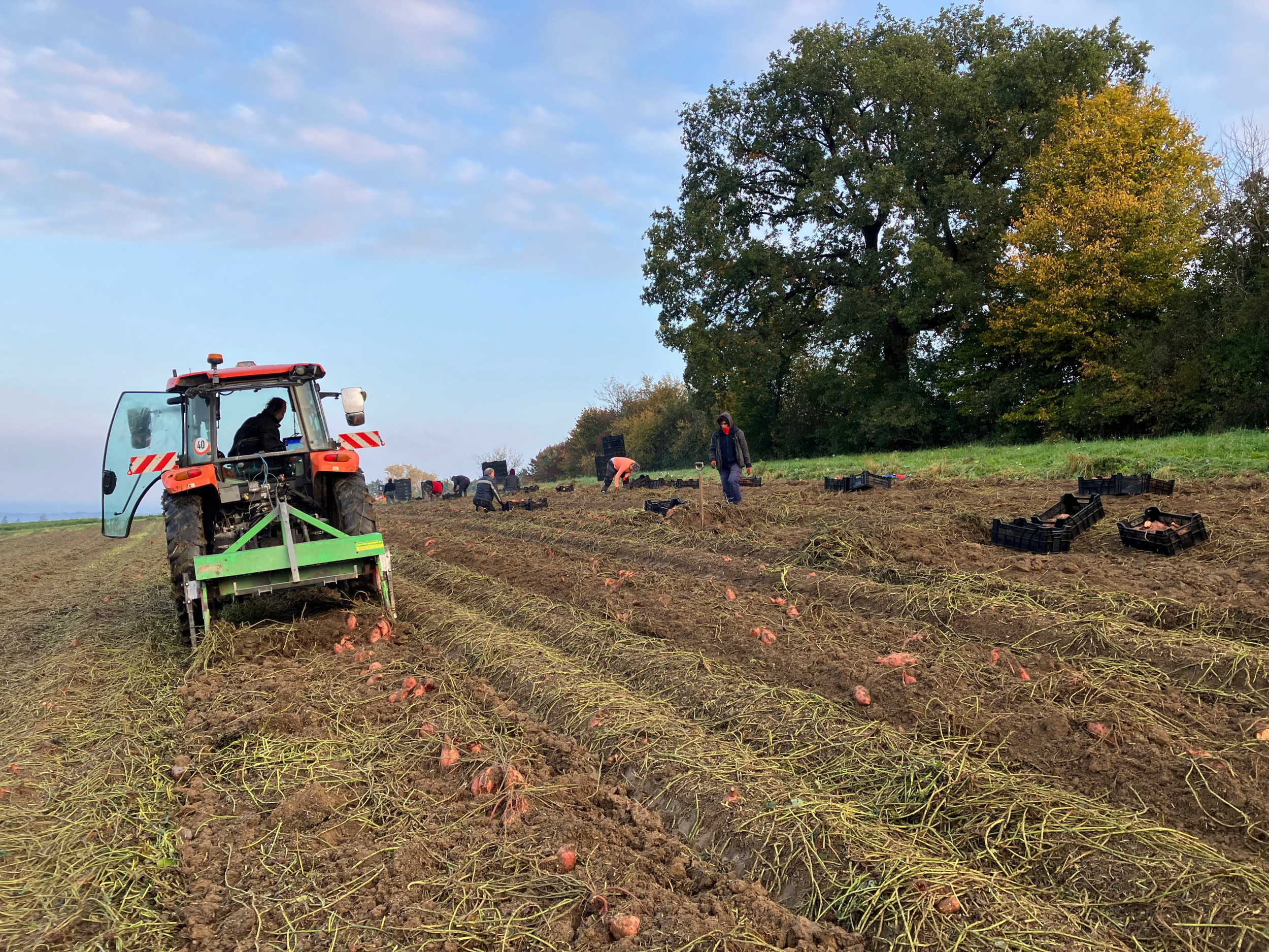 Der Biohof Zaugg in Iffwil BE baut Süsskartoffeln an. Mit dem Schüttelgraber werden die Süsskartoffeln an die Oberfläche gebracht. Dann müssen die Wurzeln von Hand eingesammelt werden.