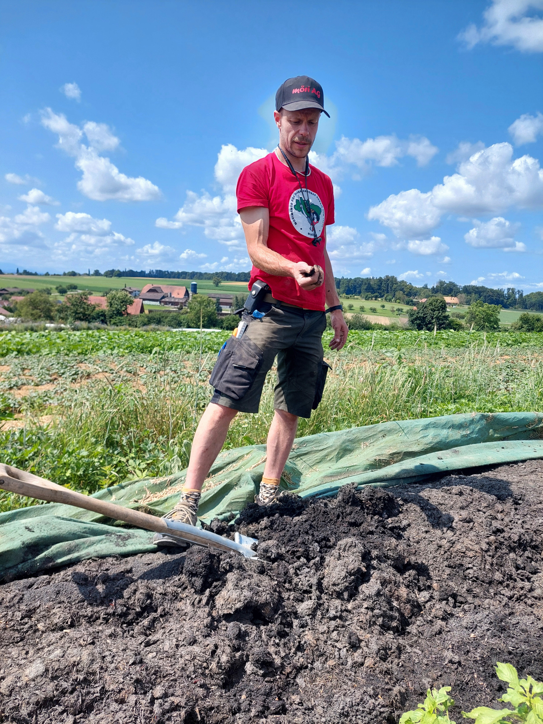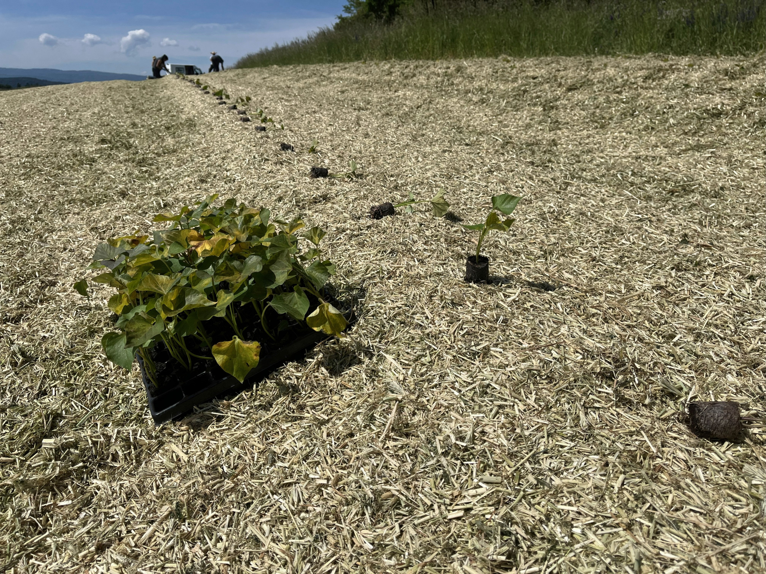 Auf dem Biohof Zaugg wurden Ende April dieses Jahres Dämme geformt und Anfang Mai eine dicke Schicht Mulch aus Gründüngung auf dem Acker verteilt. Mitte Mai wurden 6’074 Setzlinge der Sorte «Indo Sweet» und 960 Setzlinge der Sorte «Sugar Root Chestnut» von Hand in Mulch gepflanzt.