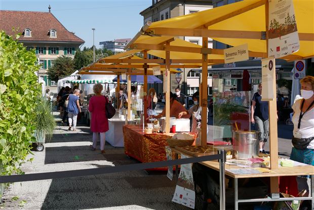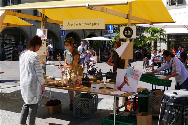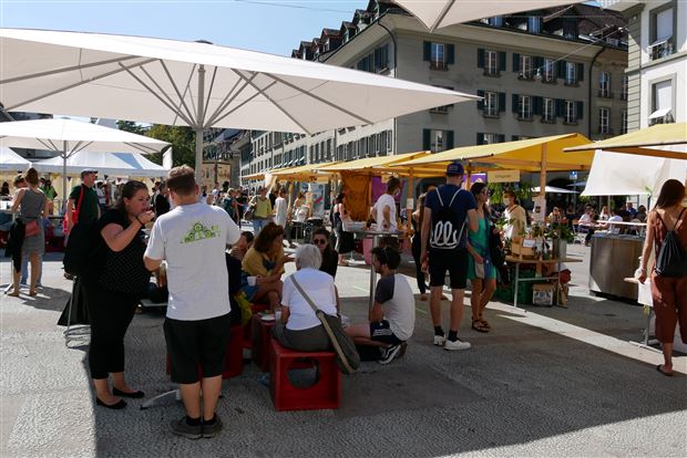 Das Wetter war perfekt für den Auftakt der dritten Ausgabe der Kulinata in Bern. Unter blauem Himmel strömten von allen Seiten Menschen auf den Waisenhausplatz. Mehr als 50 Produktionsbetriebe, Bldungsinstitutionen, Läden, Restaurants und Organisationen präsentieren rund um das Thema nachhaltige Ernährung.