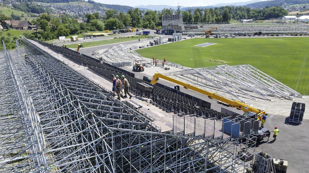 Die Ausmasse sind enorm: Mit einem Fassungsvermögen von 50’900 Schwingfans wird es die mit Abstand grösste Zuschauertribüne der Schweiz sein. Auch die 15’000 Quadratmeter grosse, gut zweieinhalb Fussballfelder umfassende Kampfarena sucht ihresgleichen. Auf den sieben, mit 245 Kubikmetern Sägemehl bestreuten Kampfplätzen werden sich an zwei Tagen rund 280 Schwinger messen, die ohne Feldstecher für das Publikum kaum erkennbar sein werden.