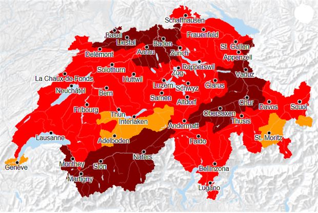 Damit ist das Risiko von Waldbränden mittlerweile ausser in Genf in allen Kantonen gross (Stufe 4) oder sehr gross (Stufe 5). Überall ausser im Kanton Genf gilt entweder ein absolutes Feuerverbot oder ein Feuerverbot im und nahe vom Wald. Allerdings kann es innerhalb eines Kantons regionale Unterschiede bei der Gefahrenstufe geben. In der Übersicht des Bundesamts für Umwelt (Bafu) wird jeweils die höchste Gefahr im Kanton dargestellt.