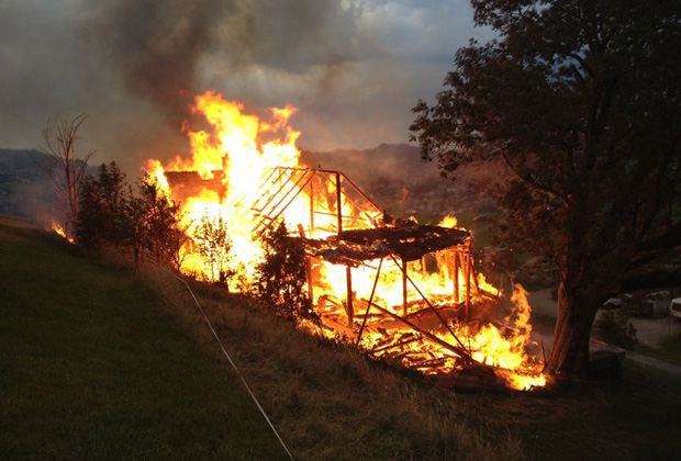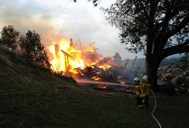 Die beiden männliche Personen hatten am Dienstagabend die offene Feuerstelle unmittelbar neben der Westfassade in Betrieb genommen. Der plötzlich stark auffrischende Westwind hatte die beiden aber überrascht. Durch die Böen entstand ein Funkenflug, der auf den angrenzenden Stall und auf das Wohngebäude übergriff, heisst es in der Mitteilung. In wenigen Minuten sei das ganze Bauernhaus in Vollbrand gestanden. Die drei Bewohner des Hauses und die beiden Männer konnten sich demnach selbst in Sicherheit bringen.