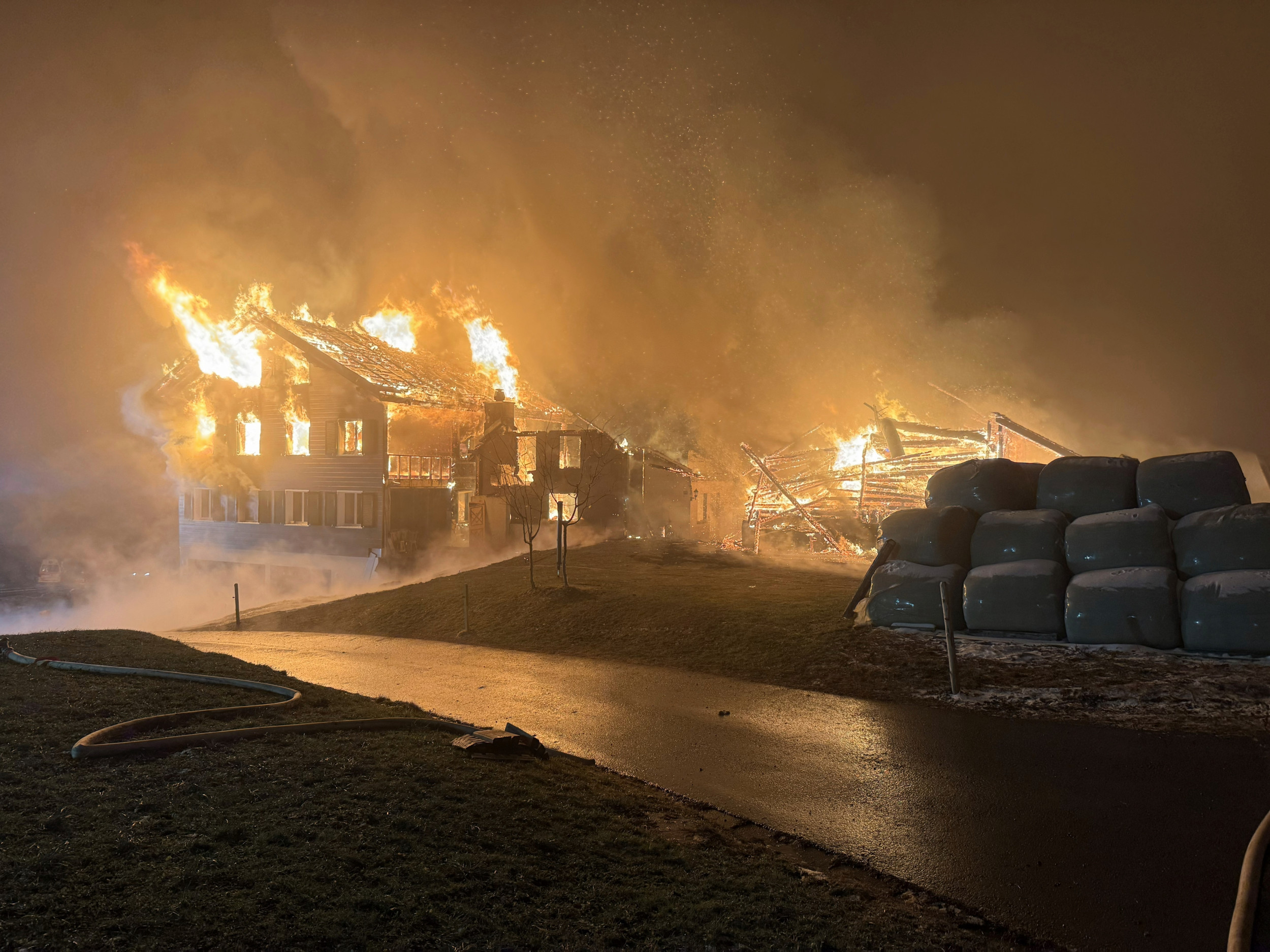 Die Feuerwehr rückte mit einem Grossaufgebot aus. Doch die Flammen waren nicht mehr aufzuhalten. Sie griffen auf das neue Wohnhaus sowie den angrenzenden Stall über. Die Gebäude waren nicht mehr zu retten und brannten vollständig nieder. Ein weiterer, sich ebenfalls auf der Liegenschaft befindlicher Stall konnte durch die Feuerwehr vor den Flammen gesichert werden.