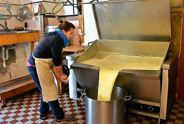 Den Drink kochen die beiden Frauen im Tank auf 96 Grad auf, lassen ihn dann auf rund 80 Grad abkühlen, leeren ihn in den Stahltopf und mischen die gelbe Flüssigkeit mit dem Gerinnungsmittel Nigari. Meist ist es Guégan, die Molke abschöpft, die Eiweissklumpen entnimmt und sie in der selbstfabrizierten Presse presst.
