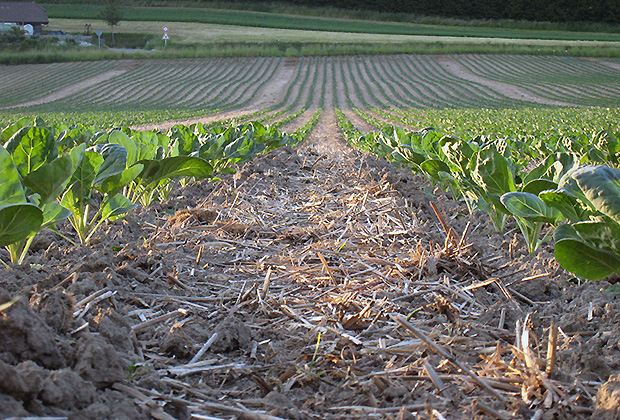 Auf den 36 Hektaren Landwirtschaftlicher Nutzfläche von Reto Minder wachsen neben Mais, Weizen, Zuckerrüben und Eiweisserbsen auch Tabak und Rosenkohl. Auch bei diesen beiden Kulturen, die nicht gesät, sondern als kleine Pflänzchen gesetzt werden, wird seit rund zehn Jahren auf den Einsatz des Pfluges verzichtet. "Ganz ohne Bodenbearbeitung geht es leider aber noch nicht." Um die Pflänzchen richtig in den Boden pflanzen zu können, wendet er das im Fachjargon Strip-Till-Verfahren an. Bei diesem wird der Boden streifenweise gelockert aber weder gewendet noch sonst wie verfrachtet.