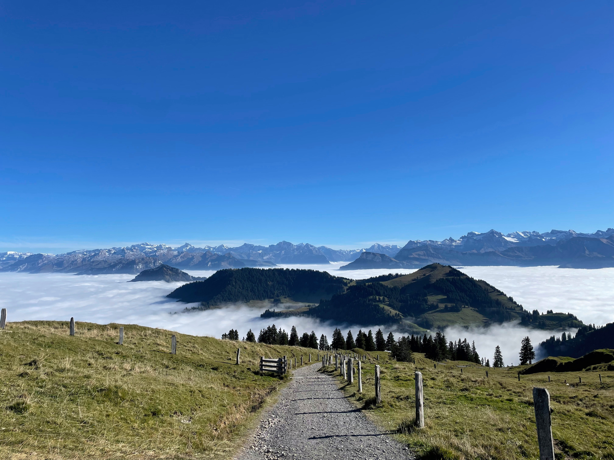 Der Blick schweift über das Nebelmeer, das den Vierwaldstättersee unter sich verbirgt, hinüber zu Uri Rotstock, Titlis bis zu Eiger, Mönch und Jungfrau. Zum Greifen nah der Pilatus. Offen zeigt sich hier auch die Geologie der Rigi. Grössere und kleinere, mehr oder weniger abgerundete Steine und Felsbänder mit feinstem Gestein. Es sind Ablagerungen der Ur-Reuss.