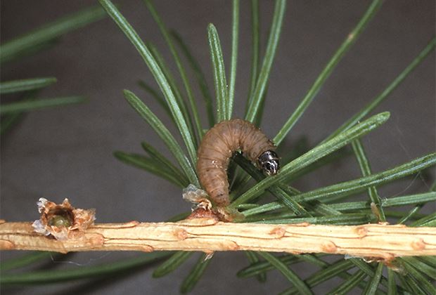 Rotbraun verfärbte Lärchenkronen mitten im Sommer: Verantwortlich dafür sind die unzähligen Raupen des Grauen Lärchenwicklers. Dieser kleine Nachtfalter vermehrt sich dieses Jahr im Engadin und im Wallis wieder einmal explosiv.