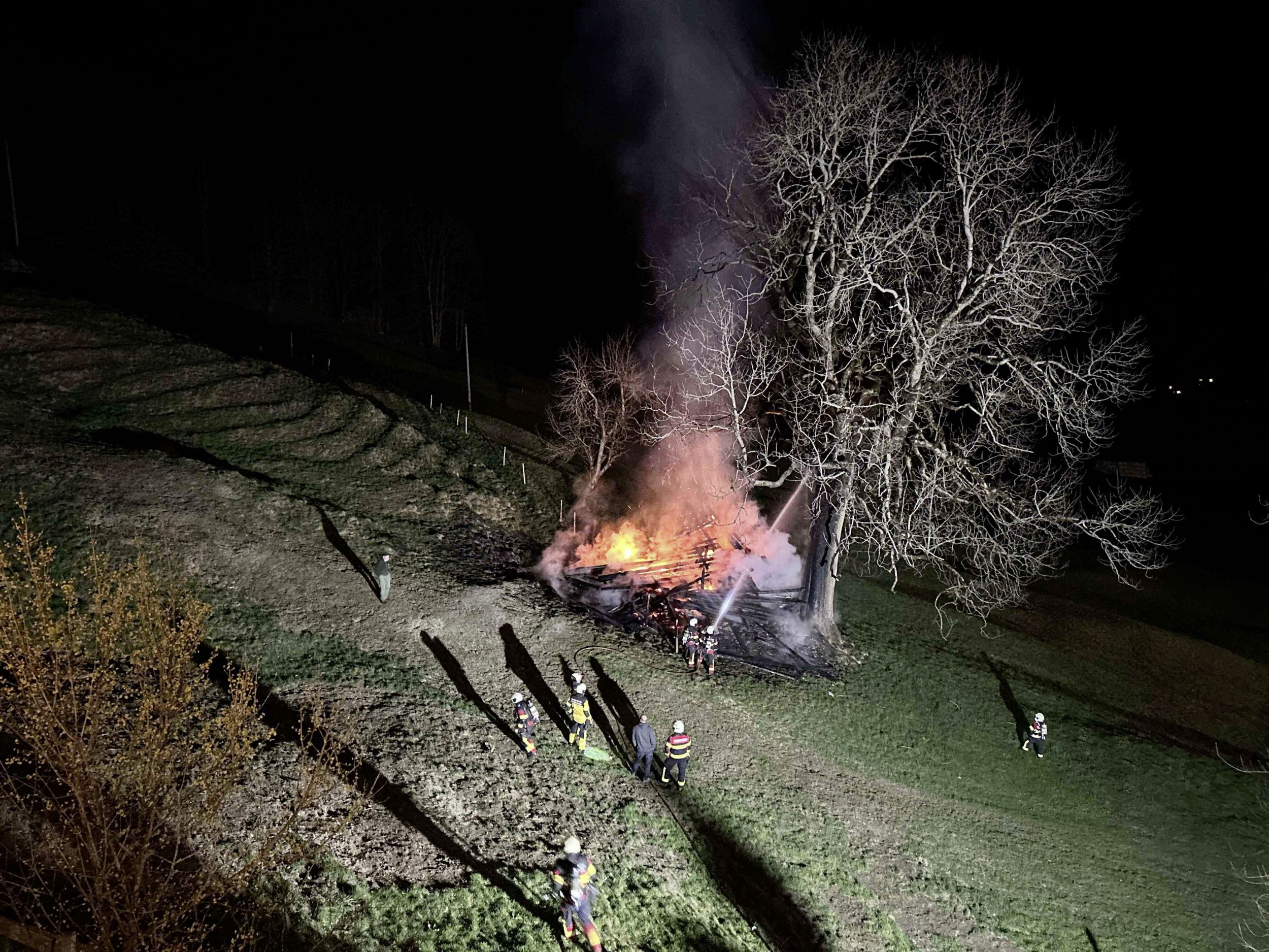 Die Feuerwehr konnte das Feuer zwar rasch löschen. Für den Stall und das darin gelagerte Material gab es keine Rettung mehr. Das Gebäude brannte vollkommen nieder.
