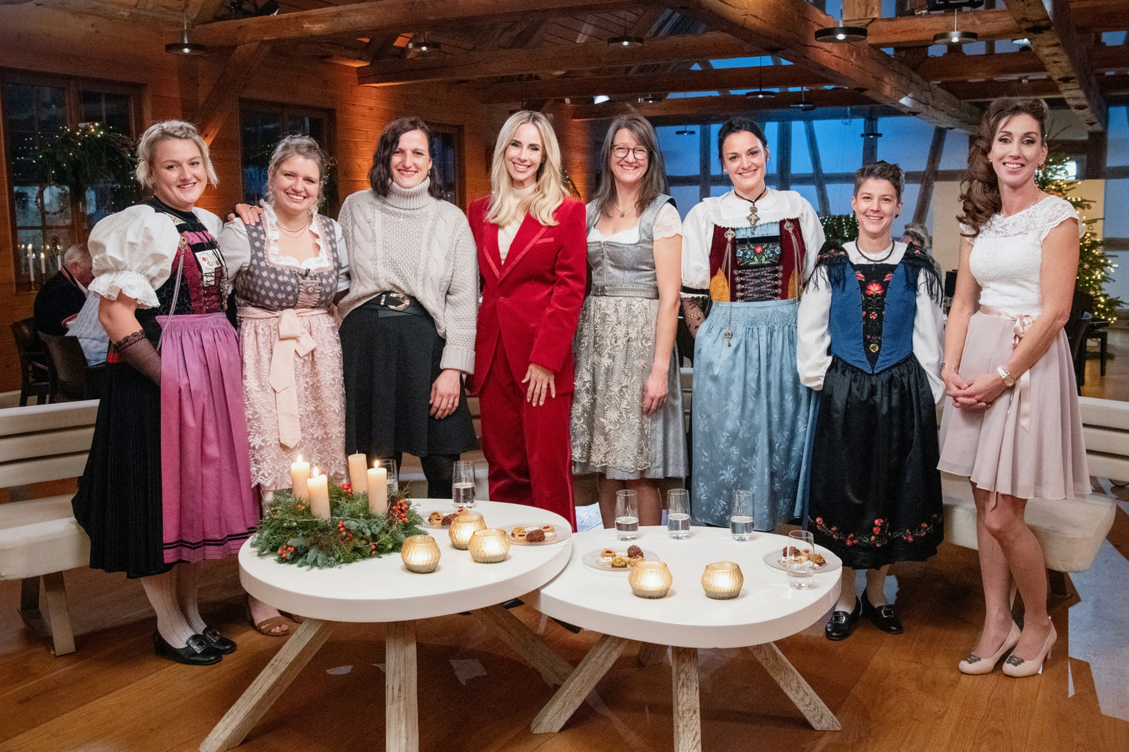 Nicole Berchtold und die sieben Landfrauen aus der 19. Staffel von Landfrauenküche in der Finalsendung: (v.l.) Lorena Röösli, Milena Knutti, Stephanie Hitz-Leuenberger, Irène Meier, Rahel Margreth, Corina Kohler