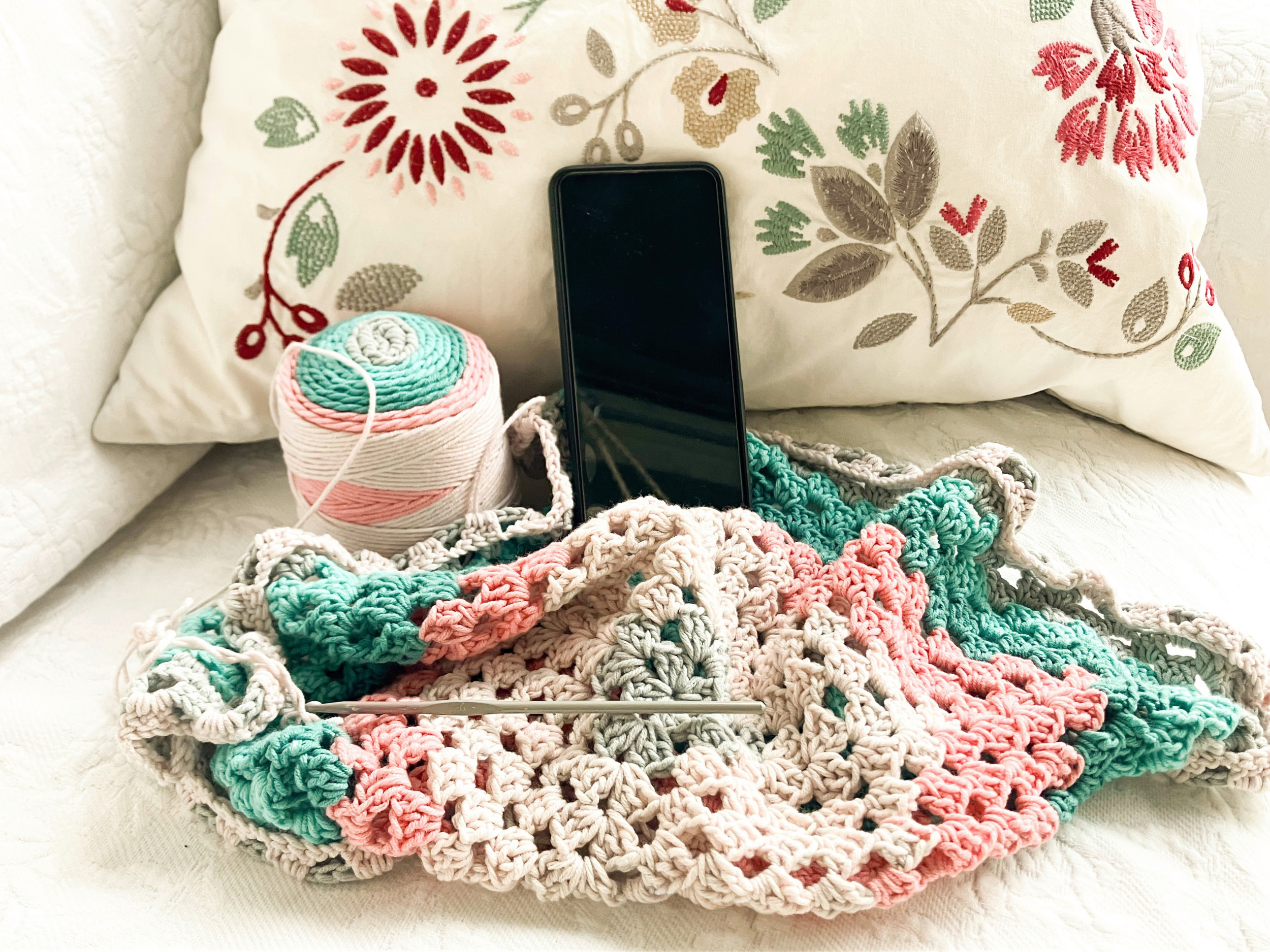 Ich genoss es, dass ich bei meiner Häkeldecke für den Puppenwagen schnell vorankam, blickte zwischendurch mit Stolz auf meine beiden turnenden Kinder und dann wieder auf all die Eltern. Es gab keinen Blickkontakt, kein Gespräch, es herrschte Ruhe, und ich fragte mich, sehe ich da alles erschöpfte, ausgelaugte Eltern, was ich sehr gut verstehen kann, oder ist es eine Gewohnheit geworden, bei jeder Wartezeit das Handy zu zücken und etwas zu konsumieren? Ich häkelte weiter und erfreute mich an meiner wachsenden Decke.