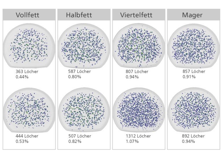 - Eine Reduktion des Fettgehaltes führt zu einer Vergrösserung der Wasserphase und damit zu einer Zunahme an vergärbarem Material. Folglich nimmt die CO2– und die Loch-Bildung zu.