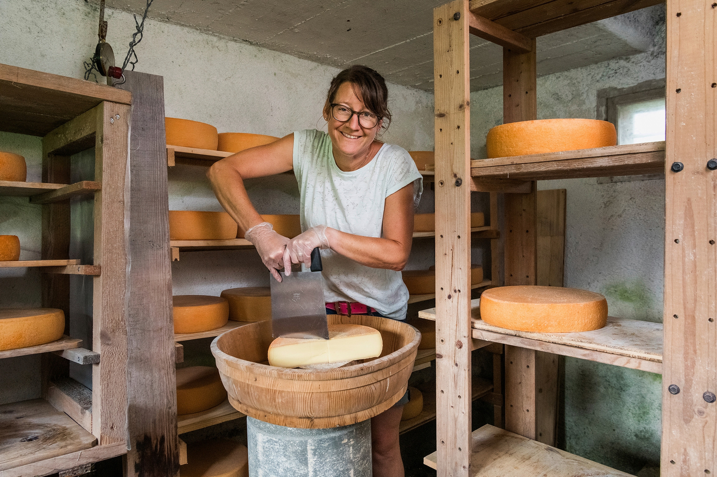 Auf ihrem Hof in Mollis GL ist die 47-jährige Landfrau Karin sehr eingespannt. Sie arbeitet oft von morgen früh bis abends spät und fällt dann müde ins Bett, erzählt sie mit ihrem typischen frohen Lachen. Manchmal zieht sie sich abends zurück in ihr kleines Büro hinter die Nähmaschine. Dort schneidert sie zum Beispiel Kleider für ihre beiden Enkel oder ein T-Shirt aus einem «Glarner Tüechli», in dem sie die Landfrauen auf ihrem Hof empfangen will.