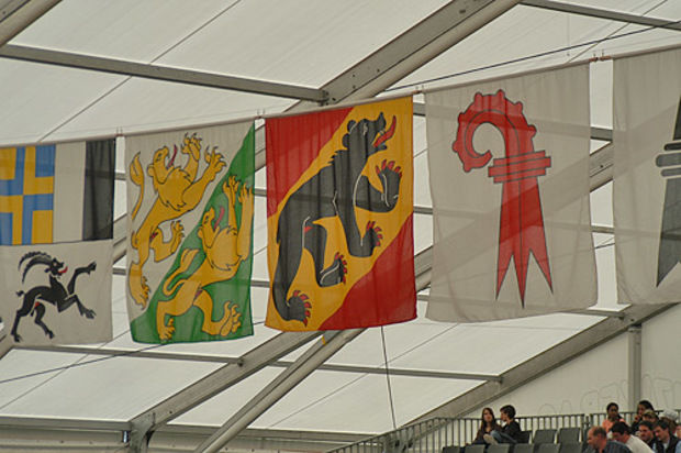 Der Berner Bär trohnt über der Ausstellungshalle neben den anderen Kantonswappen. -
