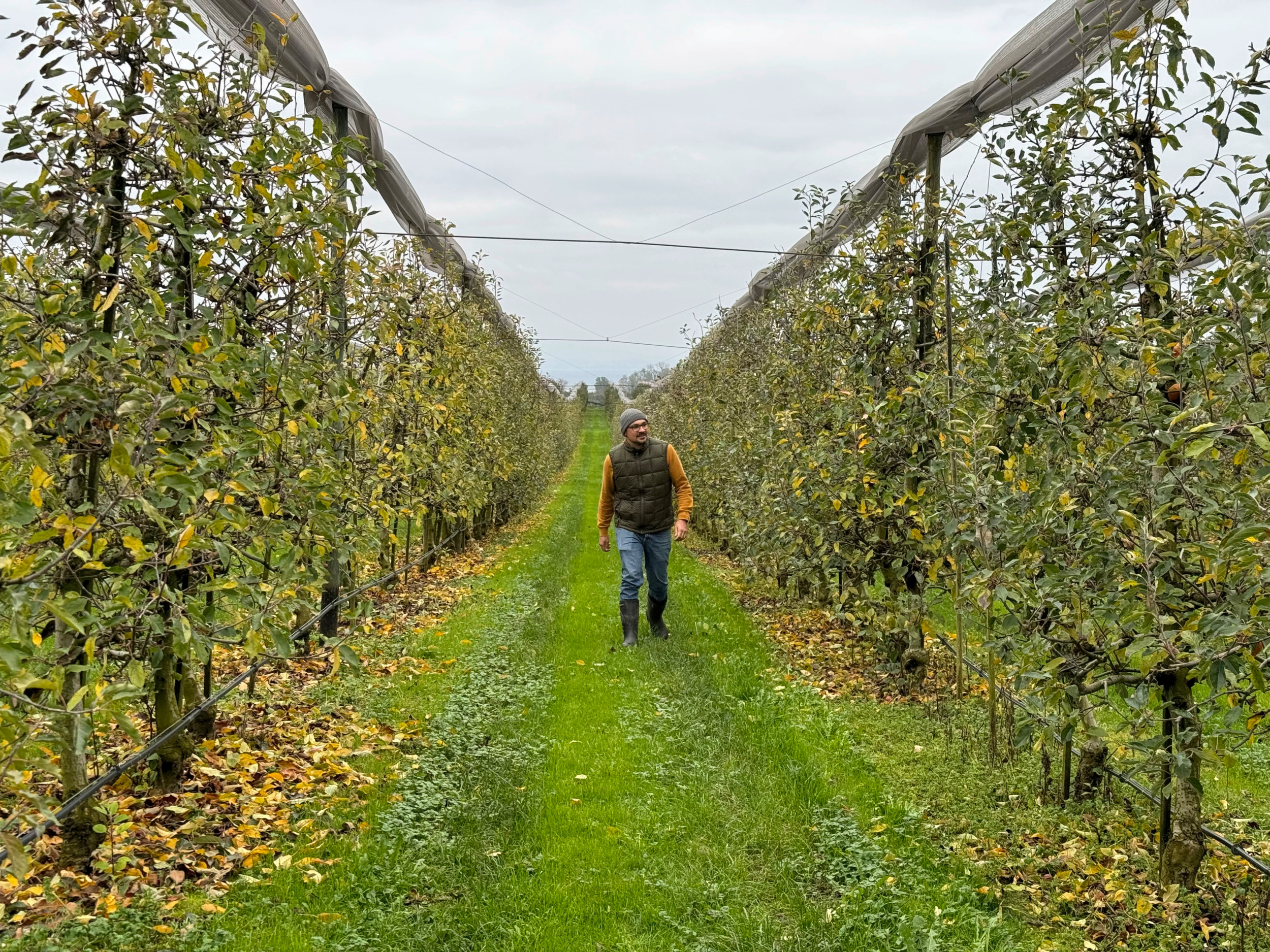 David Stacher inmitten seiner Apfelkulturen im Thurgau. Der junge Betriebsleiter setzt auf nachhaltige Bewirtschaftung und verbindet Bewährtes mit innovativen Ansätzen, um seinen Betrieb zukunftssicher zu gestalten.