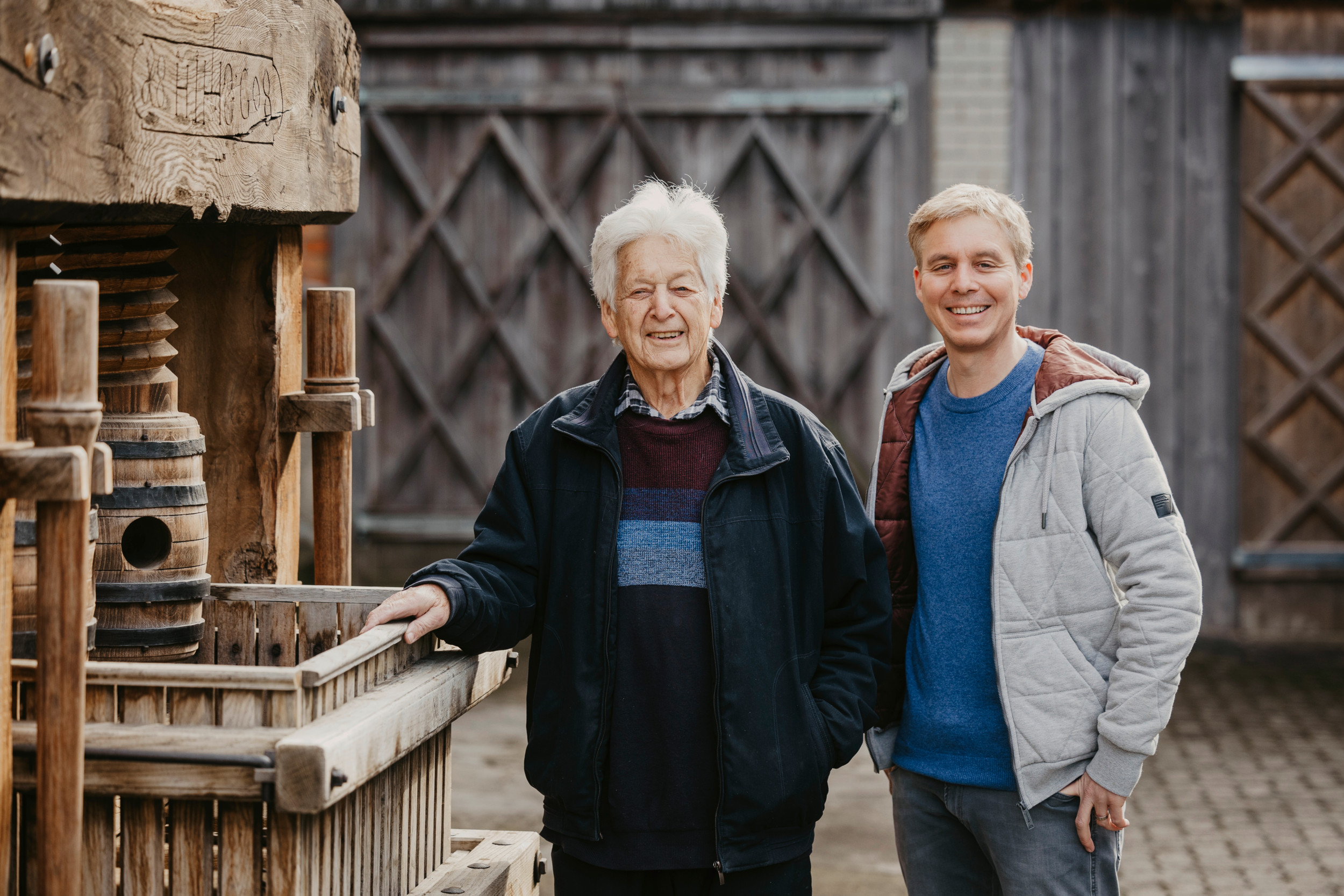 Vater Hansjörg Scherrer (l.) und Reto Scherrer bei der historischen Traubenpresse aus dem Jahr 1808. Seit 1762 führt die Familie Scherrer das Gasthaus zur Rebe in Weinfelden TG mit dem dazugehörenden 60 Aren grossen Rebberg.