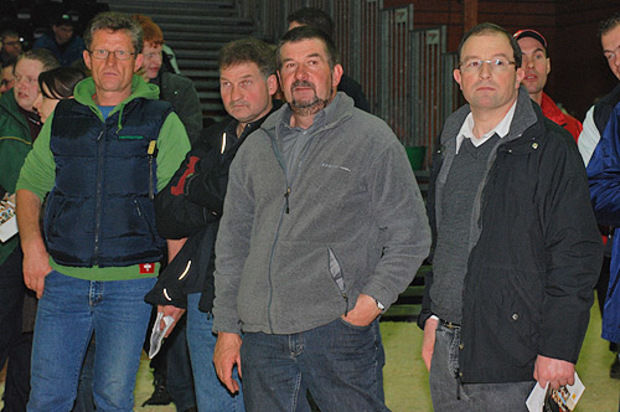Walter Münger, Thomas und Paul Hirsbrunner sowie Albert Bachmann verfolgen die Ausstellungen. -