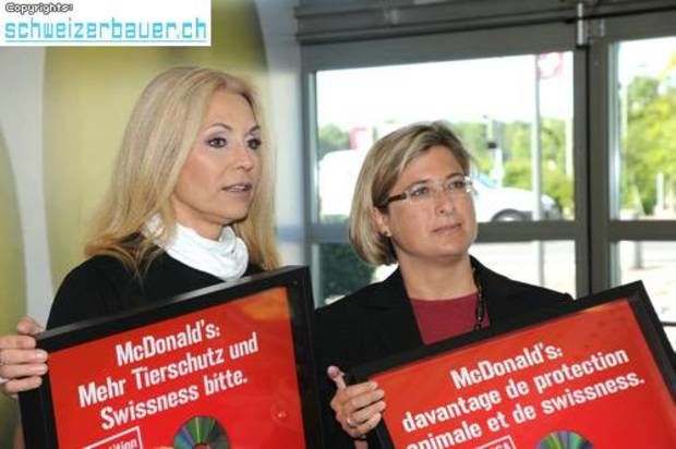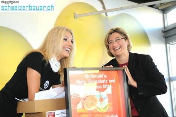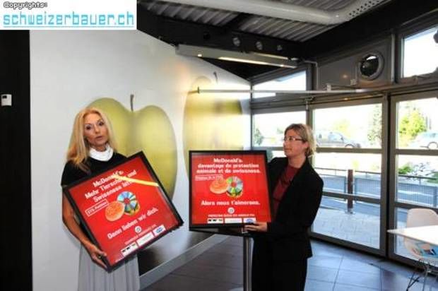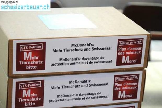 McDonald’s setzt auf den Raus-Standard, doch der Markt gibt trotz einer Tierprämie von 40 Franken nicht genügend Tiere her. Die Übergabe der Petition des Schweizerischen Tierschutzes (STS) fand im Hauptsitz von McDonald’s Schweiz im waadtländischen Crissier statt.