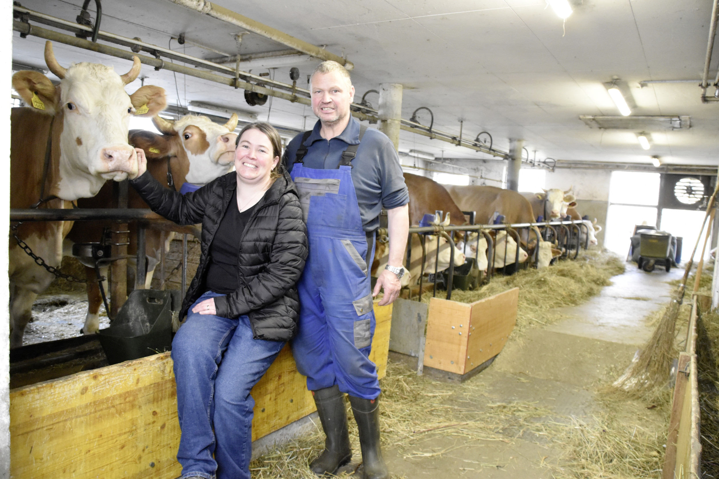 Ihr Betrieb liegt auf etwa 1’200 Metern über Meer. Das Landwirtepaar Albert und Josianne Mathieu aus Albinen VS einen Simmentaler-Reinzuchtbetrieb mit einer Fläche von rund 46 Hektaren in den Bergzonen III und IV. Sie melken 23 Milchkühe, mit derzeit 16 Rindern und 10 Aufzuchtkälbern.