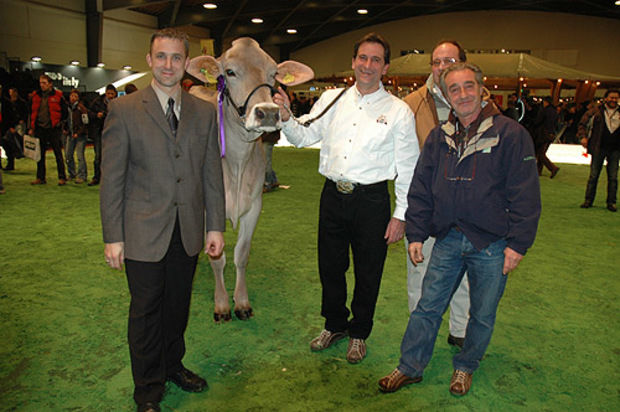 BS-Züchter Nicola Pedrini (Mitte) mit Anhang und Angelo Pozzatti freuen sich über den Kategoriensieg von Advent Redlady bei den Red-Holsteins. -