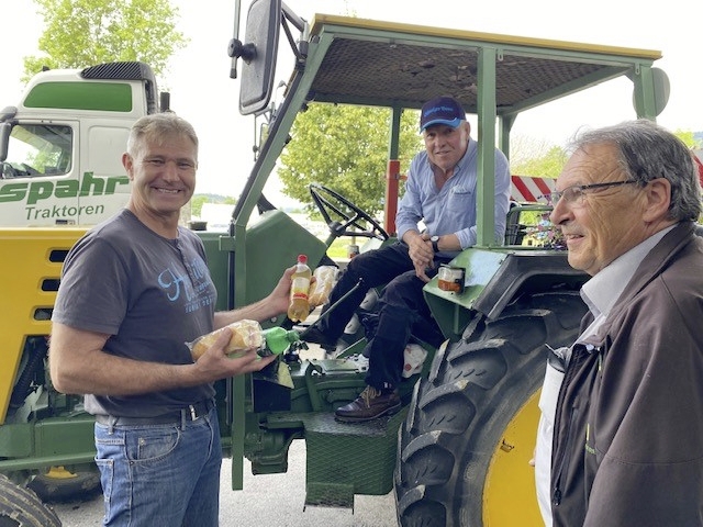 Fritz Spahr von der Fritz Spahr AG in Lengnau BE wird pensioniert. 120 Bauern mit Traktoren kommen zum Abschied. Thomas Gnägi, ehemaliger Verkäufer der Fritz Spahr AG, verteilt Speis und Trank. Kunde Ernst Salchli fährt mit seinem Bührer vorbei. - jul