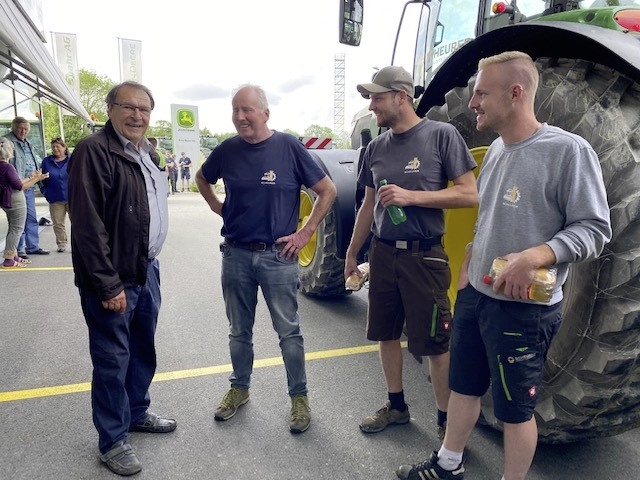 Fritz Spahr von der Fritz Spahr AG in Lengnau BE wird pensioniert. 120 Bauern mit Traktoren kommen zum Abschied. Hier Fritz Spahr mit Hansruedi Scheurer von Scheurer Lohnunternehmung Staad, Christoph Bieri, der bei der Fritz Spahr AG die Lehre gemacht hat, und Andreas Scheurer (v.l.). - jul