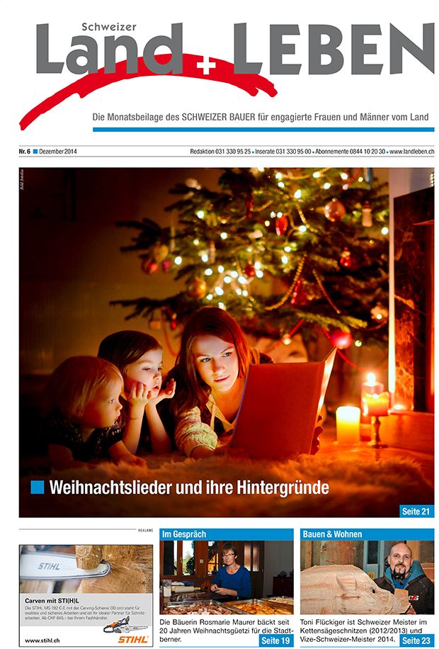 In der Dezember-Ausgabe 2014 des Schweizer Land+Leben lesen Sie, wie aus „normalen“ Liedern Weihnachtslieder wurden, wie viele Weihnachtsgüezi die Bäuerin Rosmarie Maurer pro Saison backt, wie mit einer Motorsäge aus einem Holzstamm eine Skulptur wird und weitere interessante Themen.