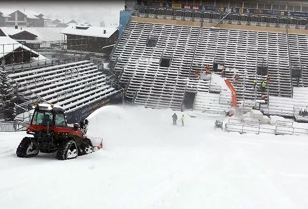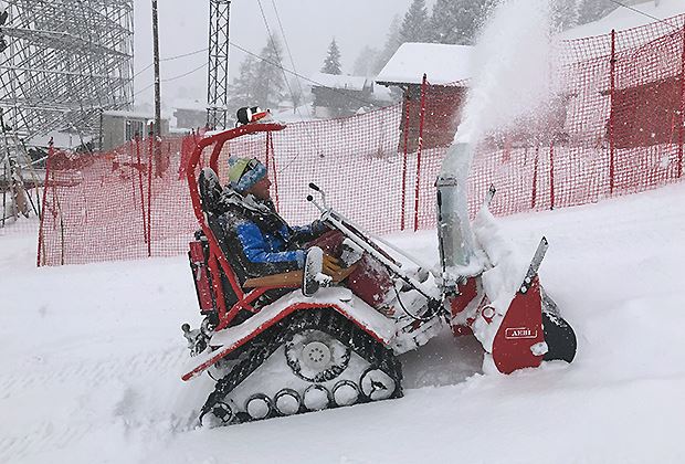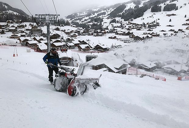 Insgesamt sind sechs Geräte in Adelboden unterwegs. Sie helfen mit, die über 40 Zentimeter Neuschnee auf und neben der Piste zu entfernen. Der Aebi TT281 mit Schneefräse auf Raupenlaufwerk kommt vor allem auf der Rennpiste zum Einsatz. Sein geringes Eigengewicht und die grossflächigen Gummiraupen schonen die Piste.