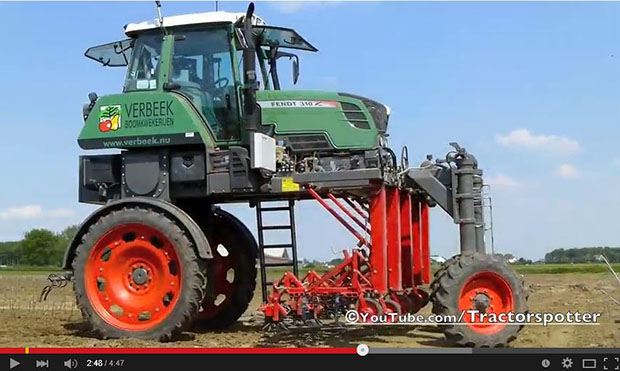 Holland scheint das Land der Spezialtraktoren zu sein. Neustes Video-Beispiel ist dieser umgebaute Fendt-Stelzentraktor. Eingesetzt wird der Vario 310 für die Reihenpflege in Baumschulen.