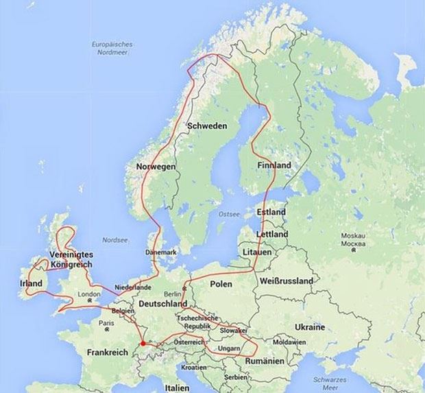 Nach Frankreich ging es Richtung Belgien und zu den brittischen Inseln. Dann nach Holland und hinauf nach Norwegen. Nördlichster Punkt war Narvik. Zurück fuhren die beiden durch Finnland (genaue Route siehe Karte in der Bildergalerie). Die ursprünglich mitgeplanten Länder Slowakei, Rumänien und Ungarn haben die beiden schlussendlich ausgelassen.