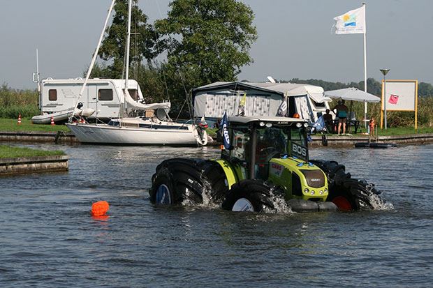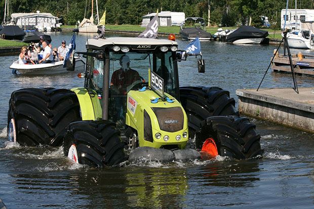 Grossvolumige Reifen ermöglichten einem über 4 Tonnen schweren Claas Axos 320 Traktor "über das Wasser zu gehen". Das Experiment hat Reifenhersteller Mitas in Holland in einem Hafenbecken durchgeführt.