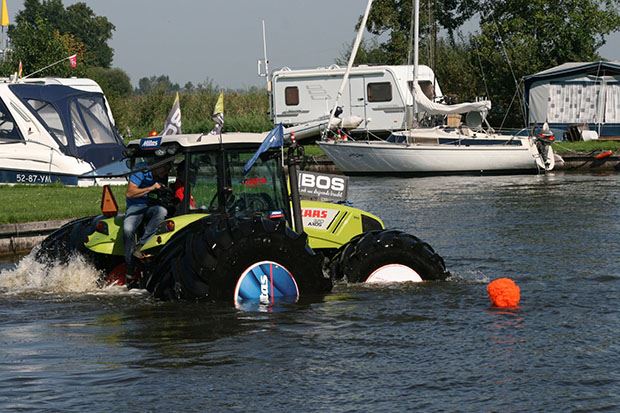Ohne die grossvolumigen Flotation-Reifen würde der Traktor unweigerlich sinken. Doch dank gründlicher Berechnungen und dem archimedischen Prinzip fuhr der Traktor erfolgreich durch das Hafenbecken und kehrte zurück an Land, ohne dass der Kapitän nasse Füsse bekam.