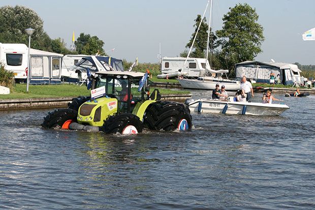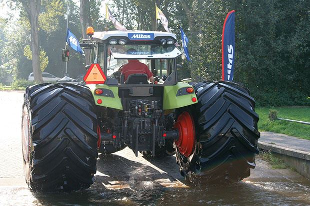 Mitas, Teil der Trelleborg Gruppe, und ihre Partner führten den ungewöhnlichen Stunt am 14. September in Offingawier in den Niederlanden durch. Einer der grössten Landwirtschaftsreifen der Welt, der Mitas 1250/50 R32 SFT, wurde auf die Hinterachse montiert und der Mitas 750/55 R 30 SFT auf die Vorderachse des schwimmenden Traktors von Claas.