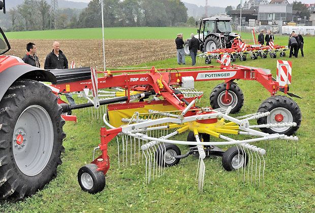 Gezeigt wurde etwa der neue Doppelschwader mit Mittenablage des Typs 612C. «Hier hat Pöttinger den Fokus auf optimale Wendigkeit mit gleichzeitger boden- und futterschonender Technik gelegt», sagte Geschäftsführer Hanspeter Hitz. Mit einem Kreiseldurchmesser von 2,80 m und einem Kurvenbahndurchmesser von 600 mm ist der 612 C das Einstiegsmodell in der Top-Doppelschwader-Baureihe.