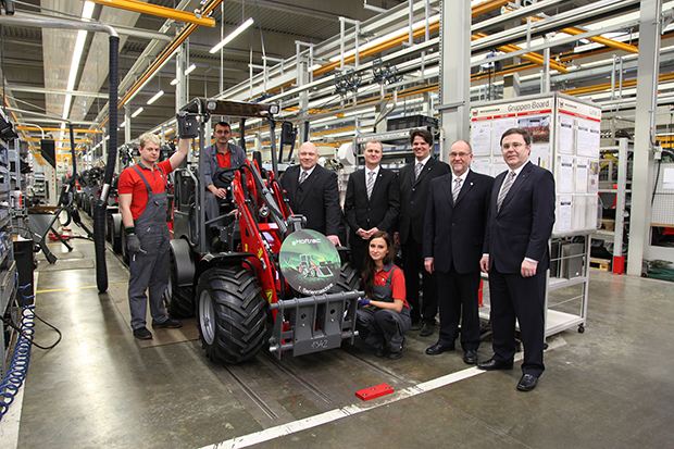 Nun hat Weidemann am 27. März 2015 die erste Serienmaschine des eHoftrac im Produktionswerk in Korbach fertiggestellt. Mit einem kleinen Festakt würdigten die drei Weidemann Geschäftsführer Bernd Apfelbeck, Klaus Pohl und Hans-Heinrich Schmidt die Aufnahme der neuen Technologie ins Produktionsverfahren.