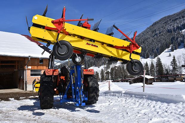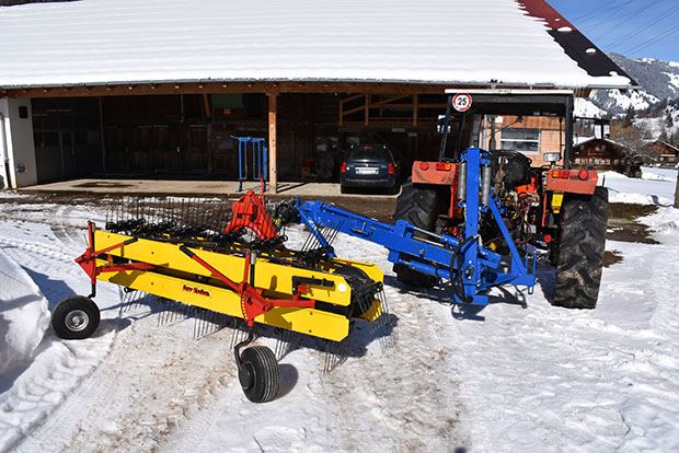 Der Doppelbandrechen von Yvan von Grünigen besteht aus einem 2,30-m-Rechen vorne an der Traktorfront und einem 2,70-m-Rechen hinten am Heck. Die grosse Herausforderung für Yvan von Grünigen war die Einheit hinten am Traktor. Während der vordere Bandrechen herkömmlich an der Fronthydraulik gekoppelt ist, wird der hintere seitlich neben dem Traktor platziert.