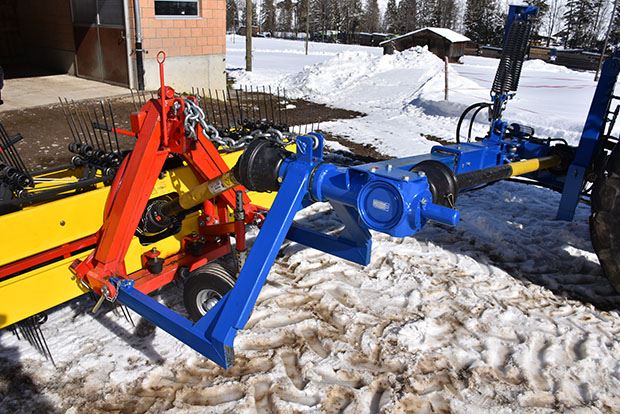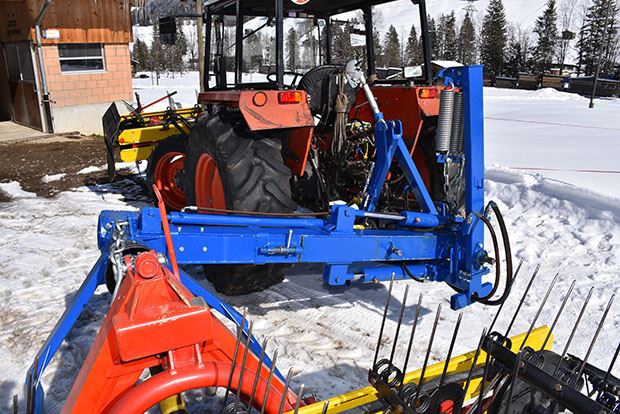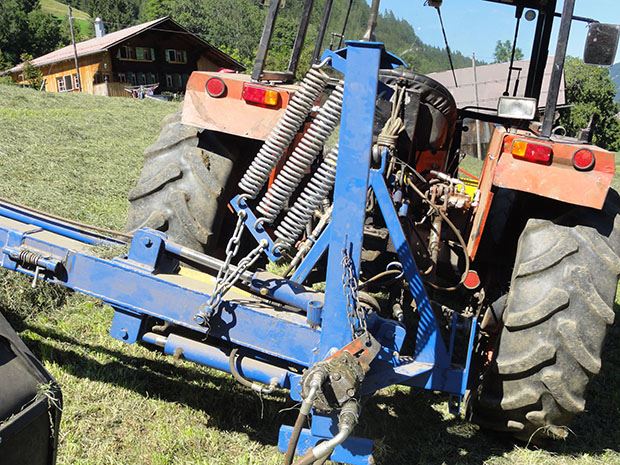 Umgesetzt hat dies von Grünigen mit einem selbst gebauten Teleskoparm, der mit Gleitplatten um 80 cm verlängerbar ist und an den der Bandrechen mit einem Dreipunkt angebaut wird. Speziell an diesem Trägerarm ist: Er kann sowohl links als auch rechts ausgeschwenkt werden. Dafür hat von Grünigen mittig ein ausgeklügeltes Drehgelenk entwickelt. Mit dieser Entwicklung kann der Landwirt nicht nur walmen, sondern das Futter auch nur auf die Seite rechen. Das kommt bei wenig Futter zum Einsatz wie zum Beispiel im Emd.