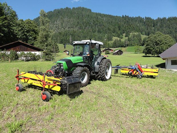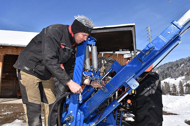 Yvan von Grünigen aus Grund bei Gstaad BE hat einen Doppelbandrechen entwickelt. Speziell an seiner Eigenbaumaschine ist der Teleskoparm, der am Heck des Traktors nach links und nach rechts ausgeschwenkt werden kann. Mit Video