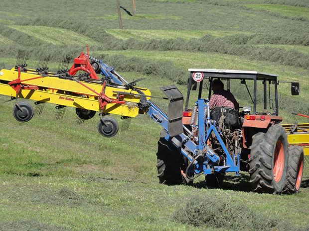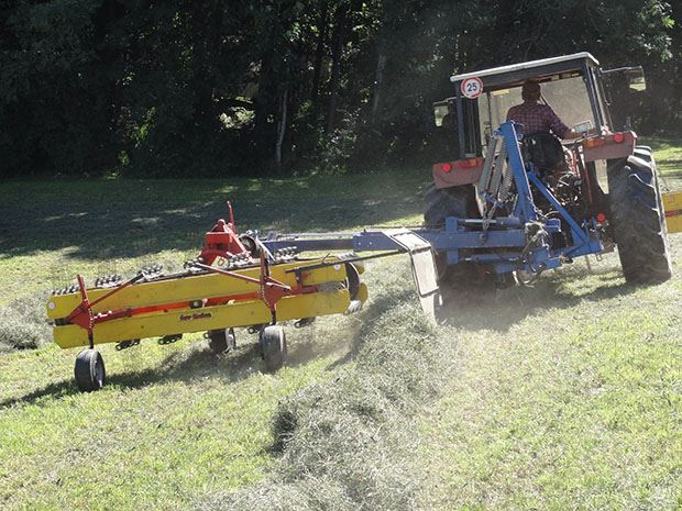 Die Konstruktion kam im letzten Sommer schon auf rund 20 Hektaren bei der Futterernte zum Einsatz. Angehängt wird der Doppelbandrechen derzeit an einem Carraro 620 mit rund 60 PS und Allrad. Dieser verfügt über keine Frontzapfwelle. Deshalb wird der vordere Rechen hydraulisch angetrieben. Der Antrieb des hinteren Bandrechens erfolgt mit drei Zapfwellen und zwei Winkelgetrieben. Das letzte Getriebe wandelt die Drehzahl von 540 auf 1000 U/Min. um.