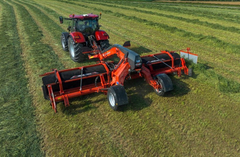 Beim Frontschwader «Merge Maxx 442F» mit einer Aufnahmebreite von 3 Metern wird das Futter vor den Traktorrädern abgelegt. «Sein auf dem Markt einzigartiges Doppelbandsystem ermöglicht eine beidseitige Futterablage mit gleicher Futtermenge auf beiden Seiten», schreibt Kuhn. Kuhn will so eine «perfekte» Futterqualität garantieren.